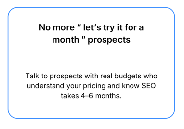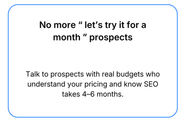 Prospects who already believe in SEO, have real budgets, and aren't "just trying it for a month" — delivered consistently, without black-box systems or monthly retainers you don't control.