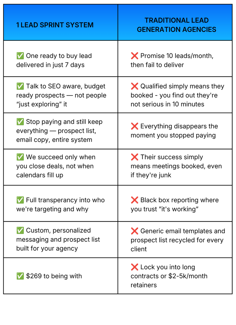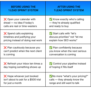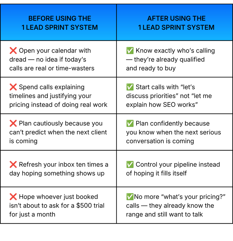 The 1-Lead Sprint System exists for one reason: to stop SEO agencies from wasting time on calls that were never meant to close.